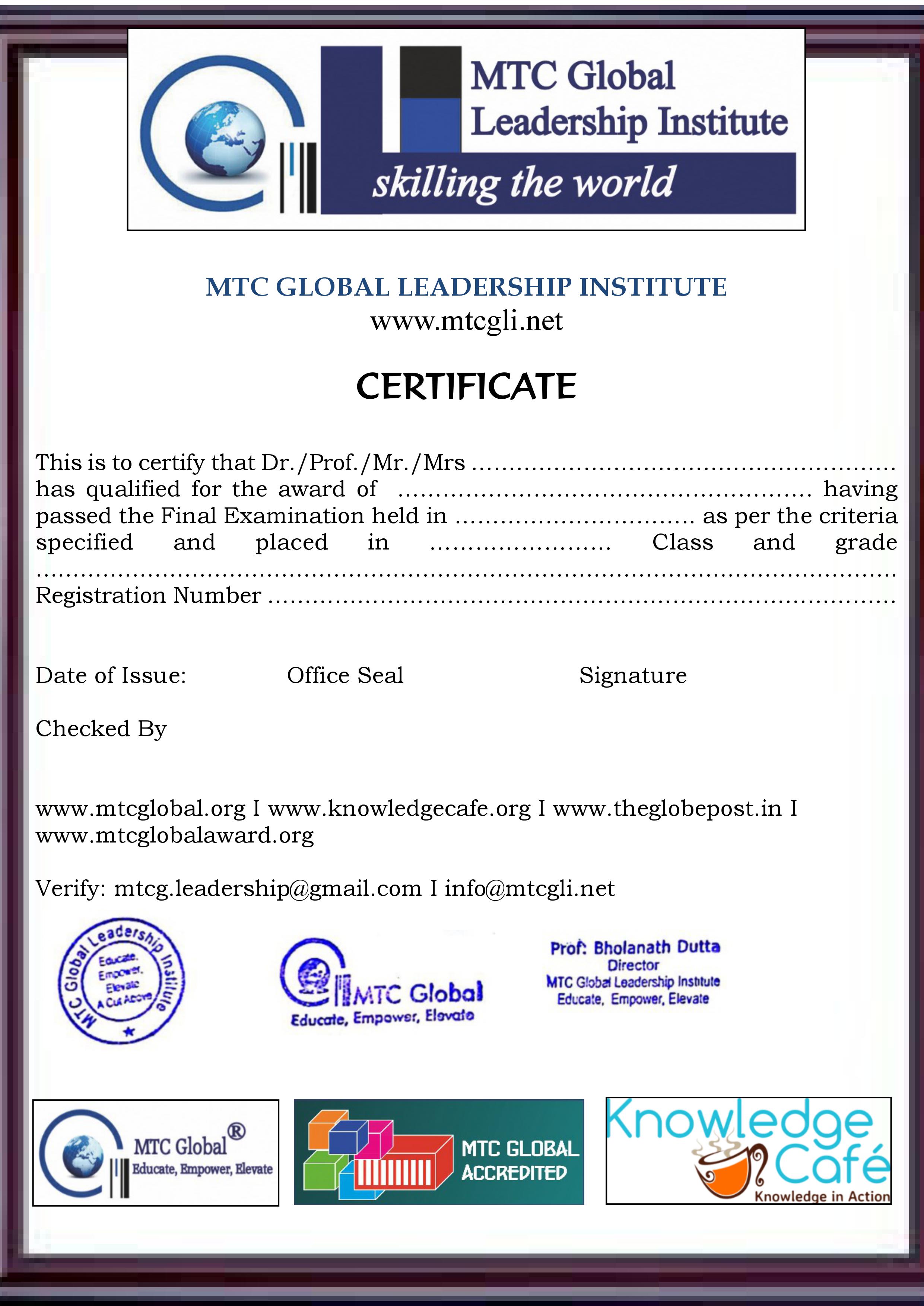 MTC Global - A non-for-profit global think tank in higher education having presence in over 30+ countries, over 1000 B-Schools, 30,000+ members, 45 national chapters, 32 international chapters and connected with millions of people across the world through its different initiatives. A participant in United National Global Compact program, United Nations Academic Impact and ISO 9001: 2015 certified organization. Registered with NITI Aayog, Government of India. Please visit us at www.mtcglobal.org , www.knowledgecafe.org , www.mtcglobalaward.org , www.globepost.com , www.worldedusummit.com , www.mtcgli.net and www.globalentrepreneursgrid.com All the courses are offered by MTC Global Leadership Institute under the aegis of MTC Global.